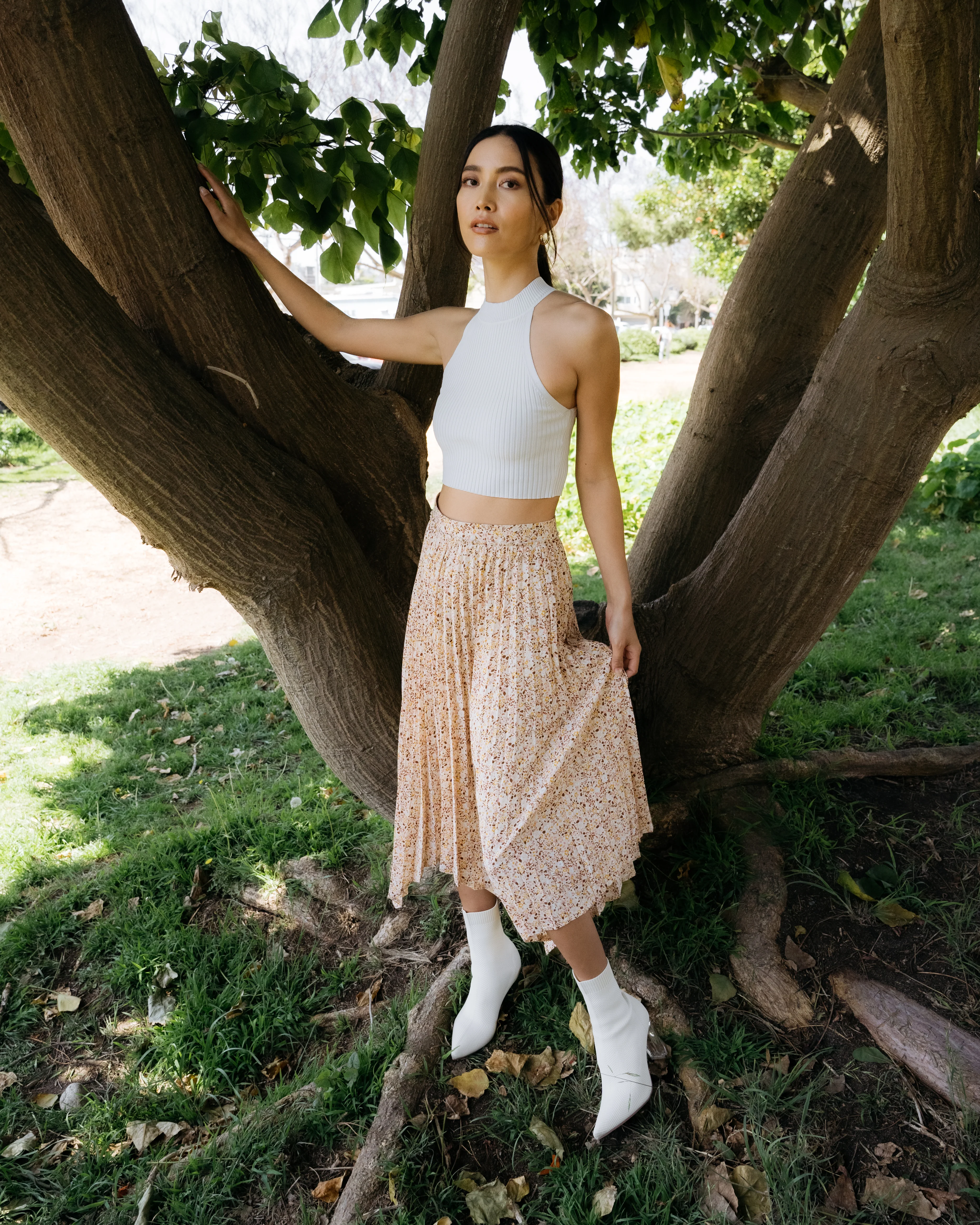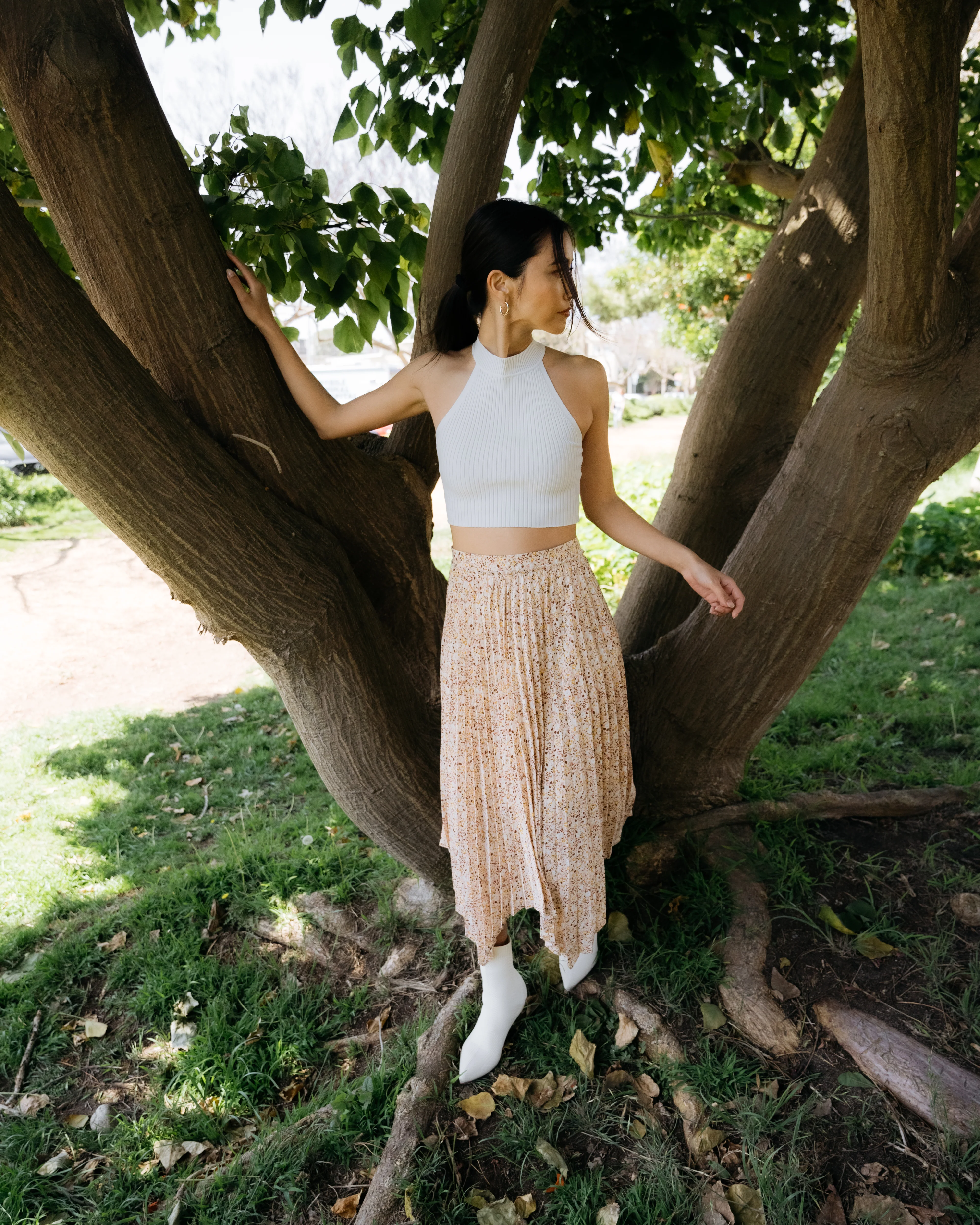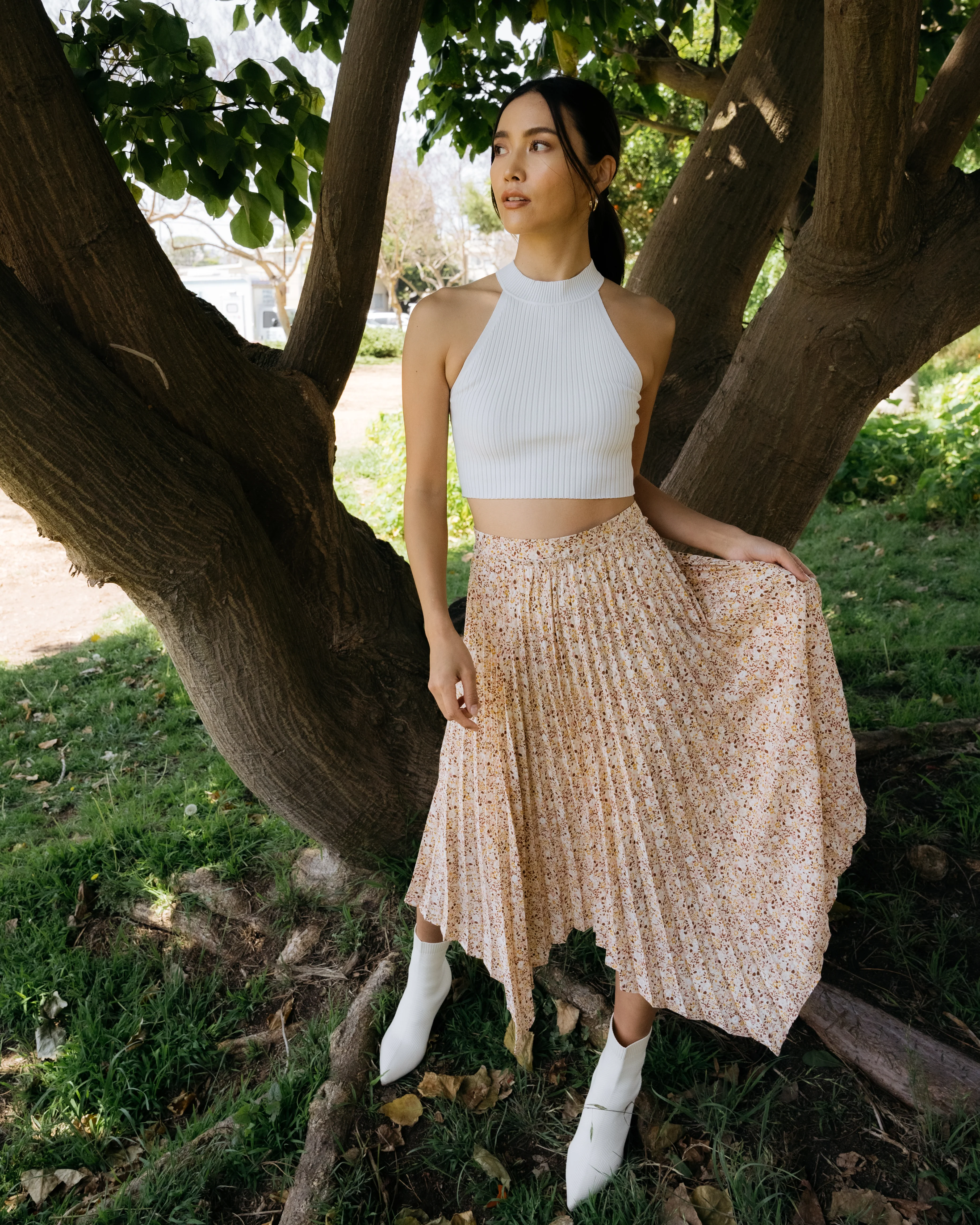 Description Light blue denim colored skirt. Elastic fitted waste with a elegant contrasting ivory eyelet bottom Elastic Waist Asymmetrical hem pleated waist ruffle 100% Polyester Designed in California by the Monarc Team Wash: Cold & Delicate Size & Fit Model's Measurements: Height 5'8", Bust 33", Waist 24", Hips 35.83