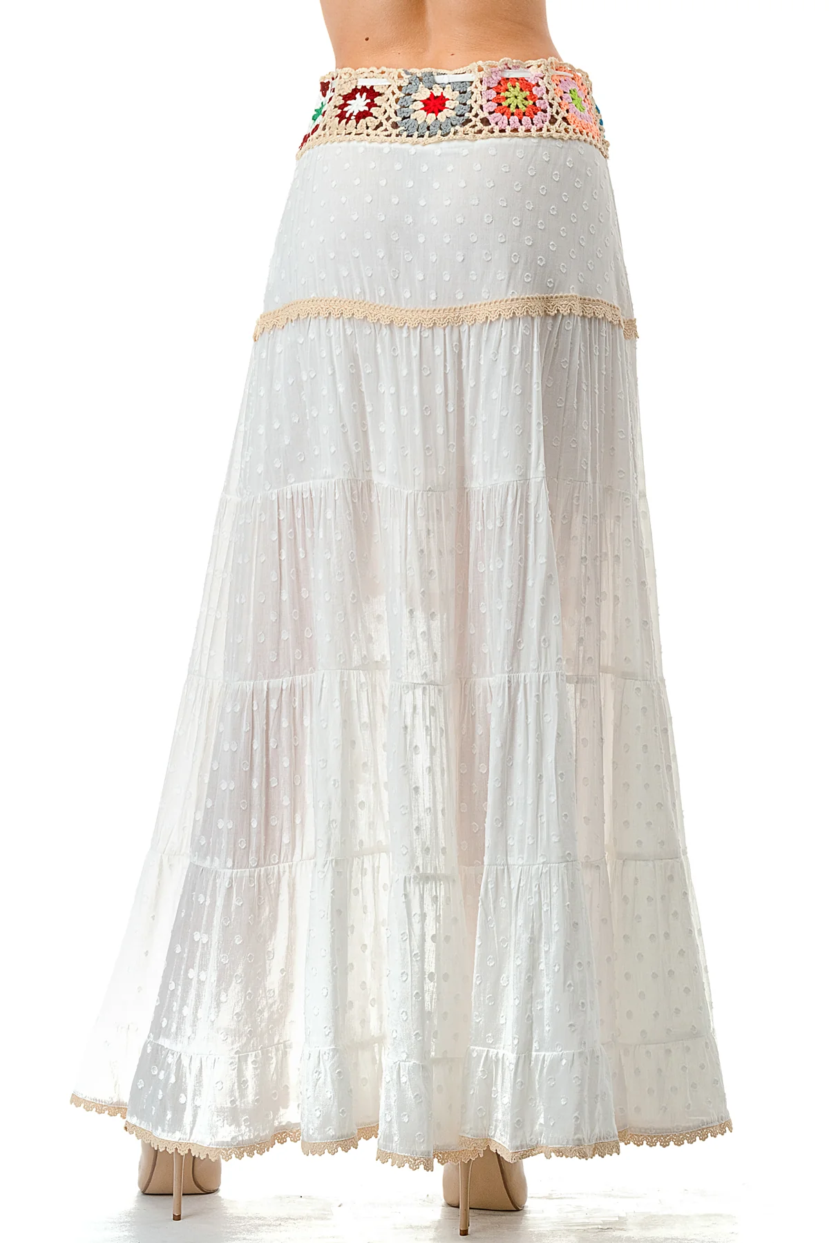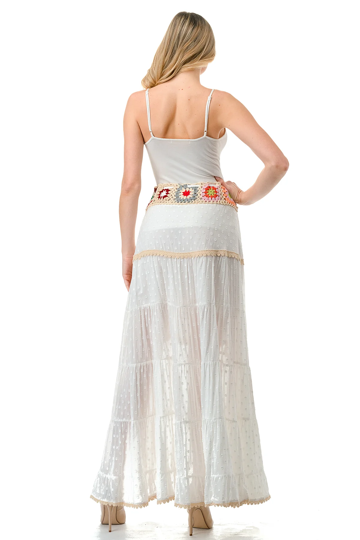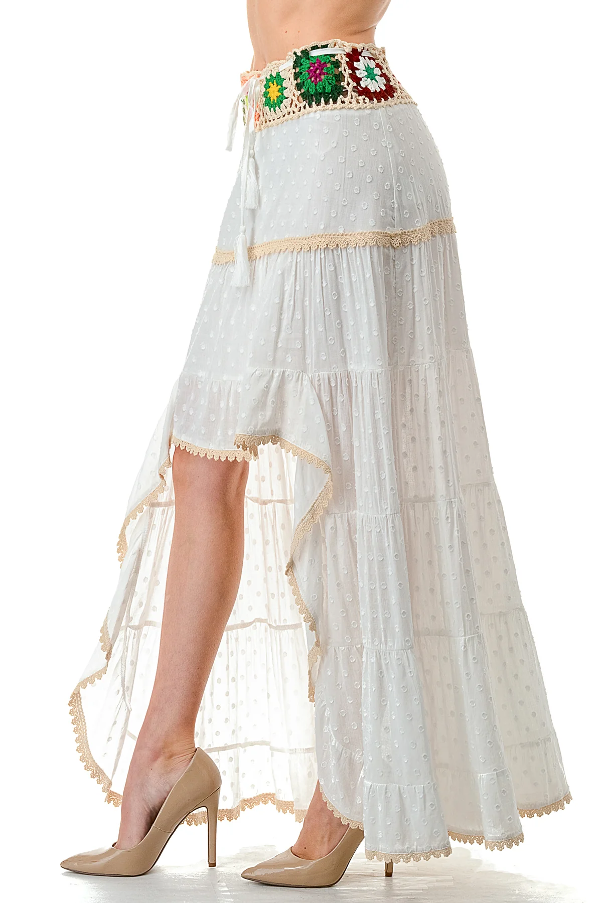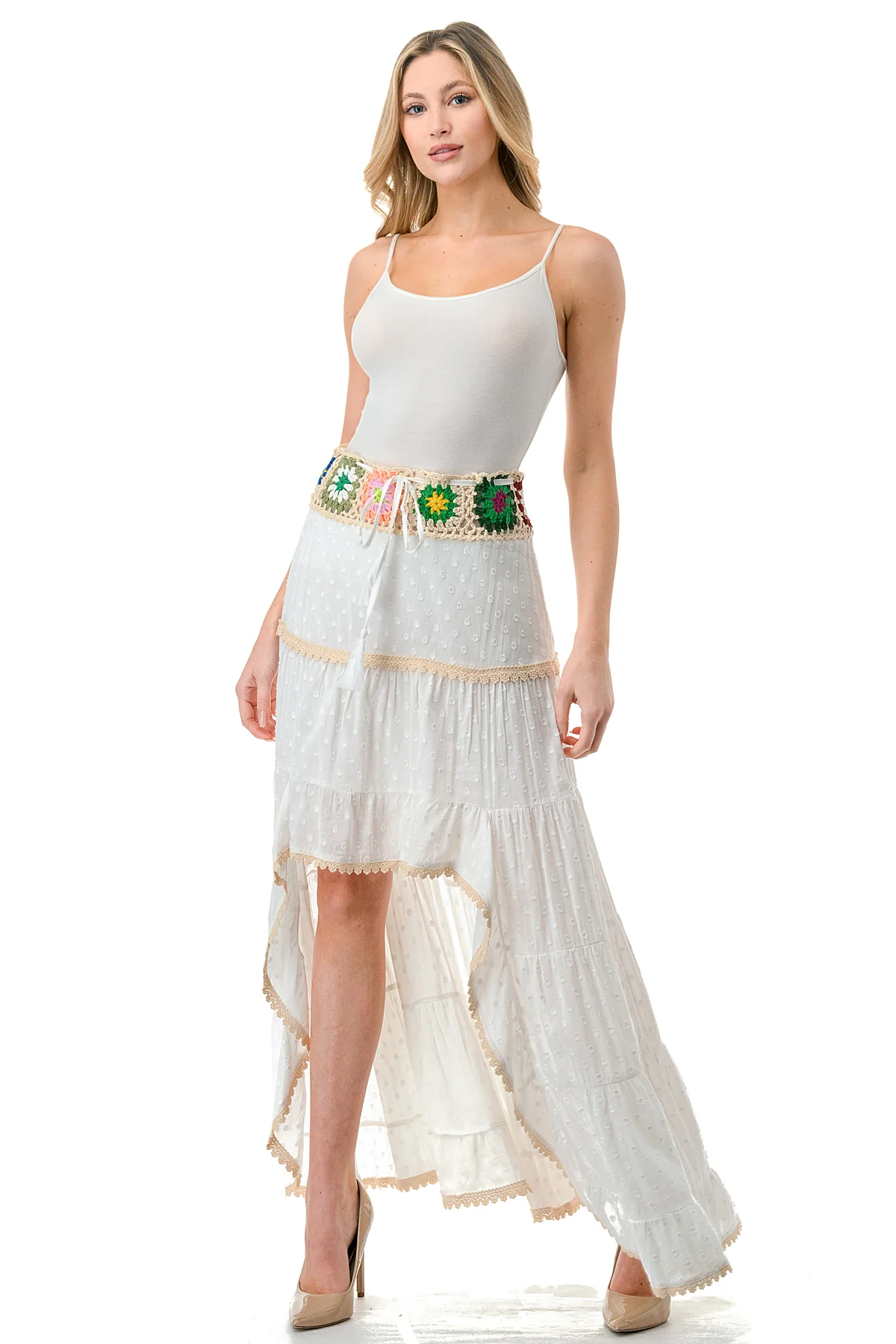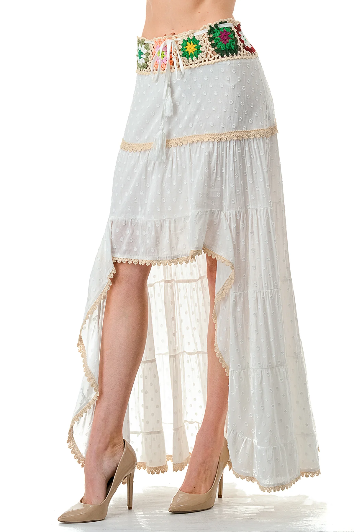 Description Ivory/Beige Trim Textured High Low Skirt Crochet Waist Contrast Lace Trims Tiered High Low Tie Waist 100% cotton Designed in California by the Solitaire Team Wash: Cold & Delicate - Spot Cleaning Recommended Size & Fit Studio Model's Measurements: Height 5'8", Bust 34", Waist 24", Hips 34" Modeled in Size