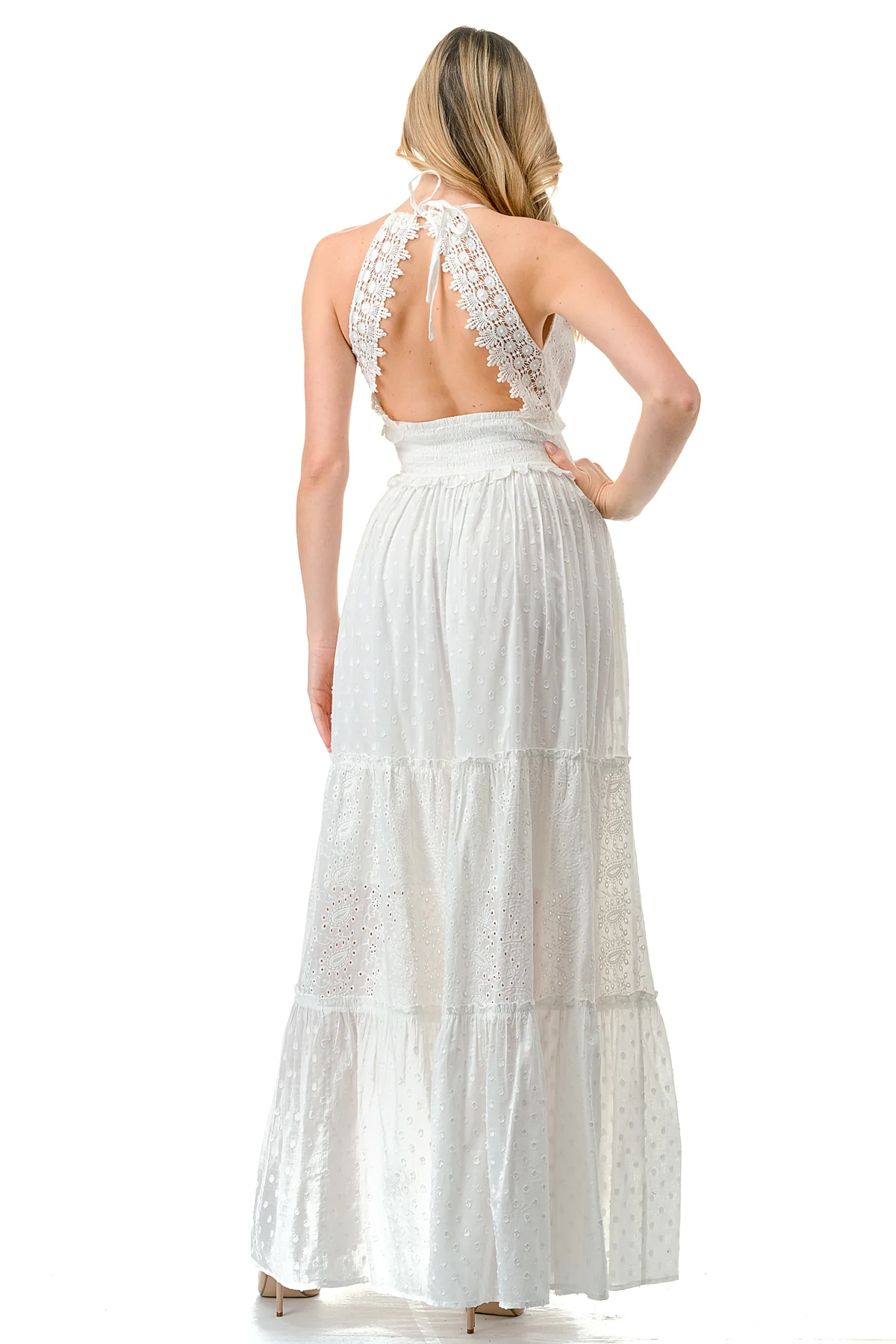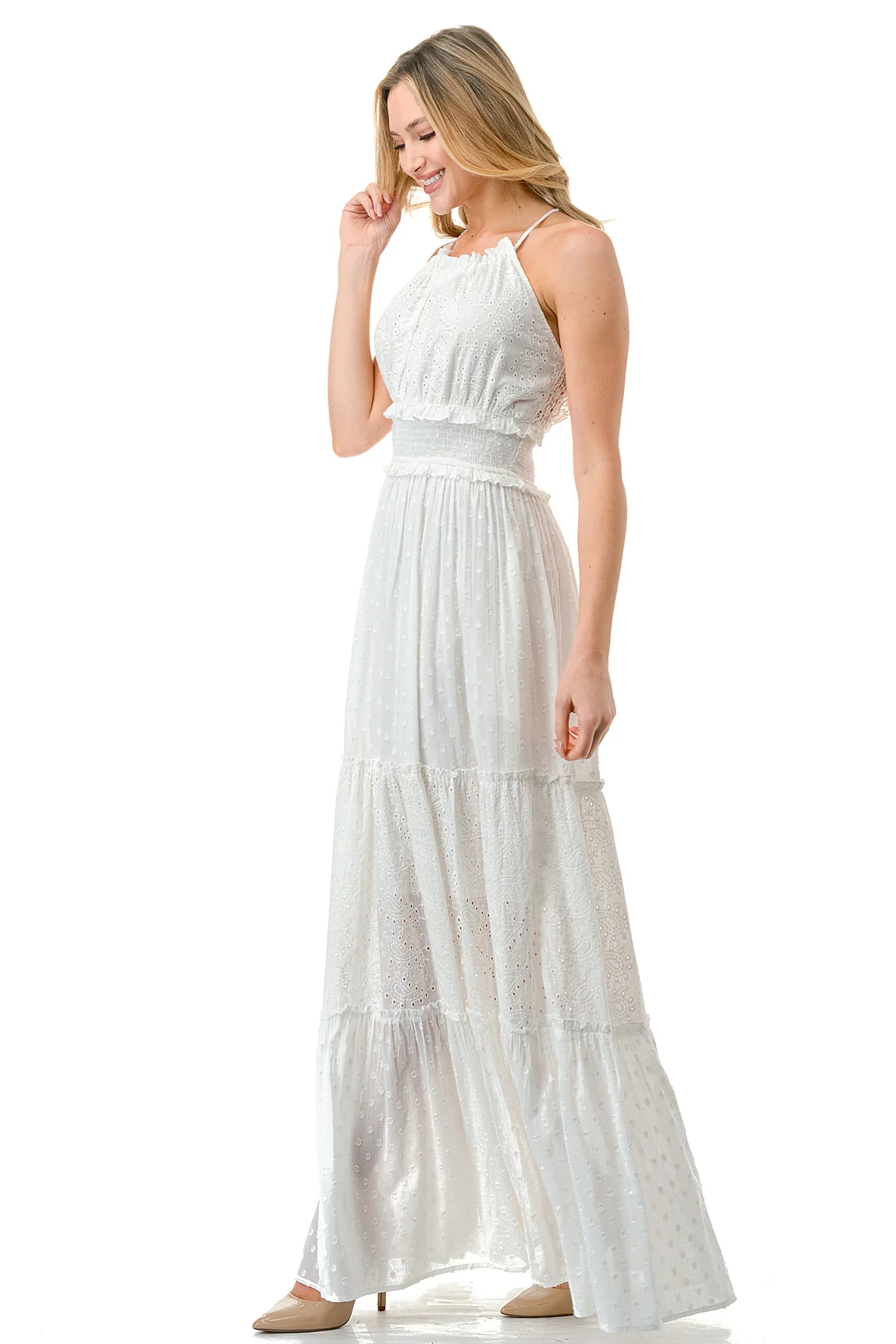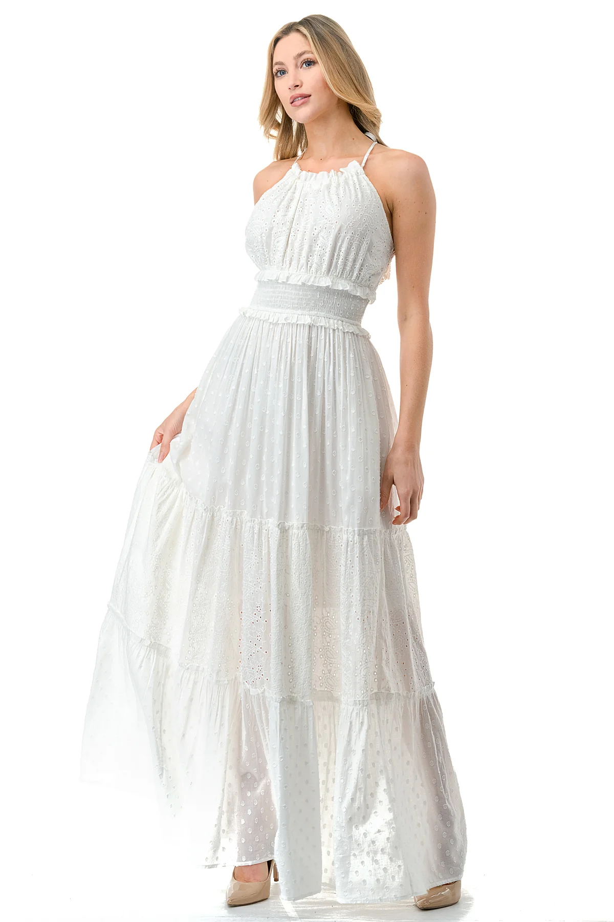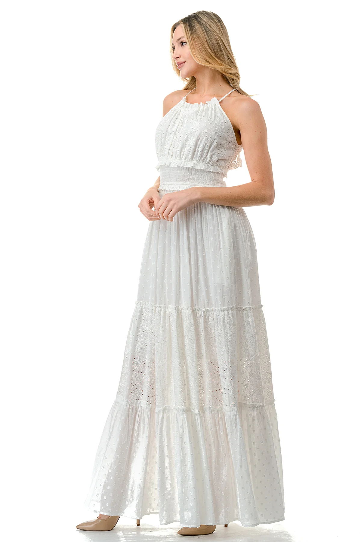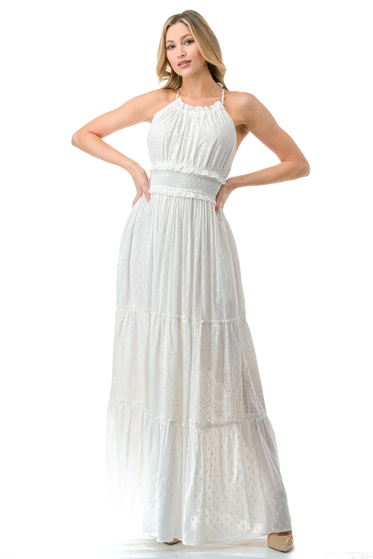 Description- Ivory Eyelet Textured Smocked Halter Dress