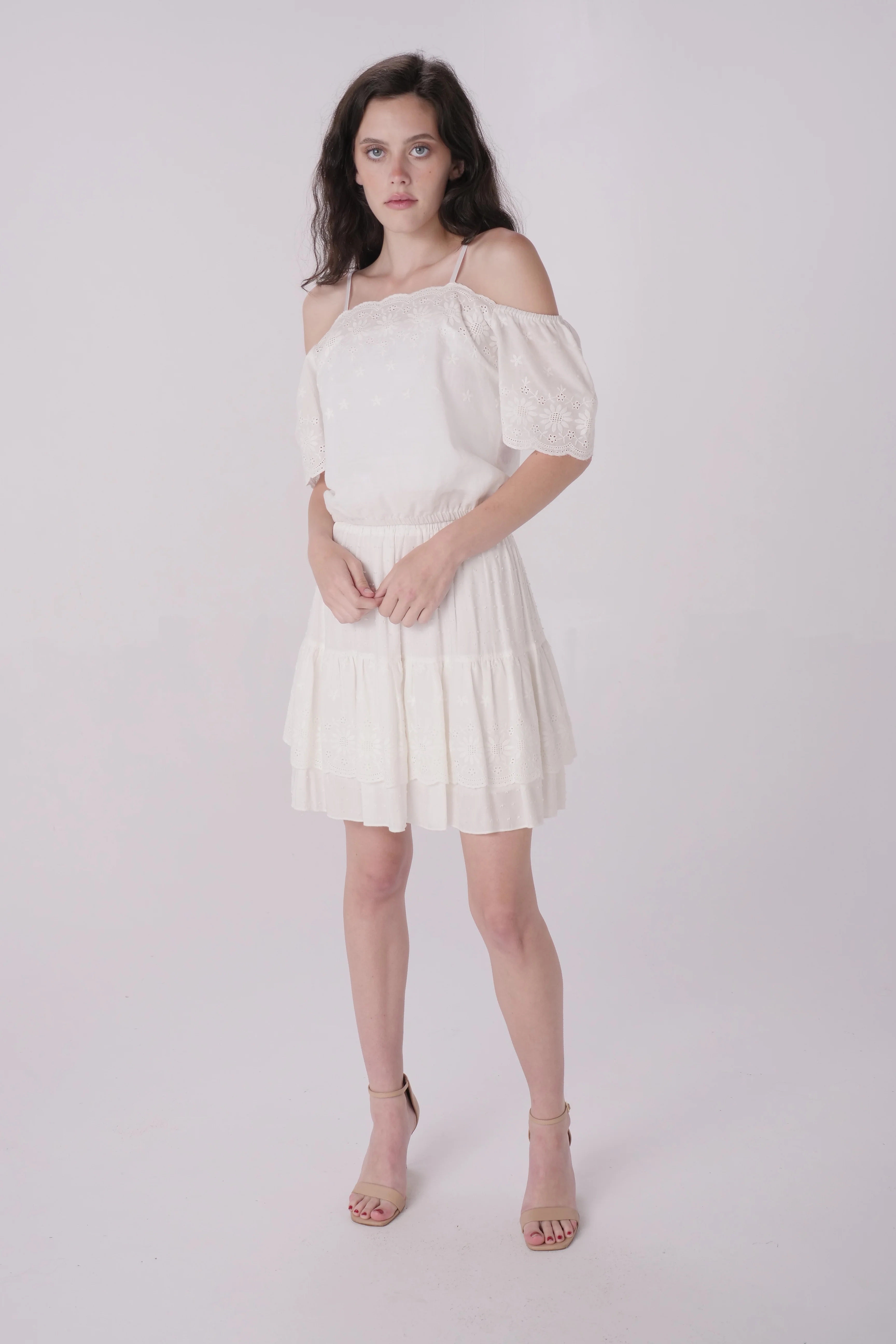 - A summer white short skirt with tiered eyelet sectioning. Wear it with the top from the same set to complete the look.