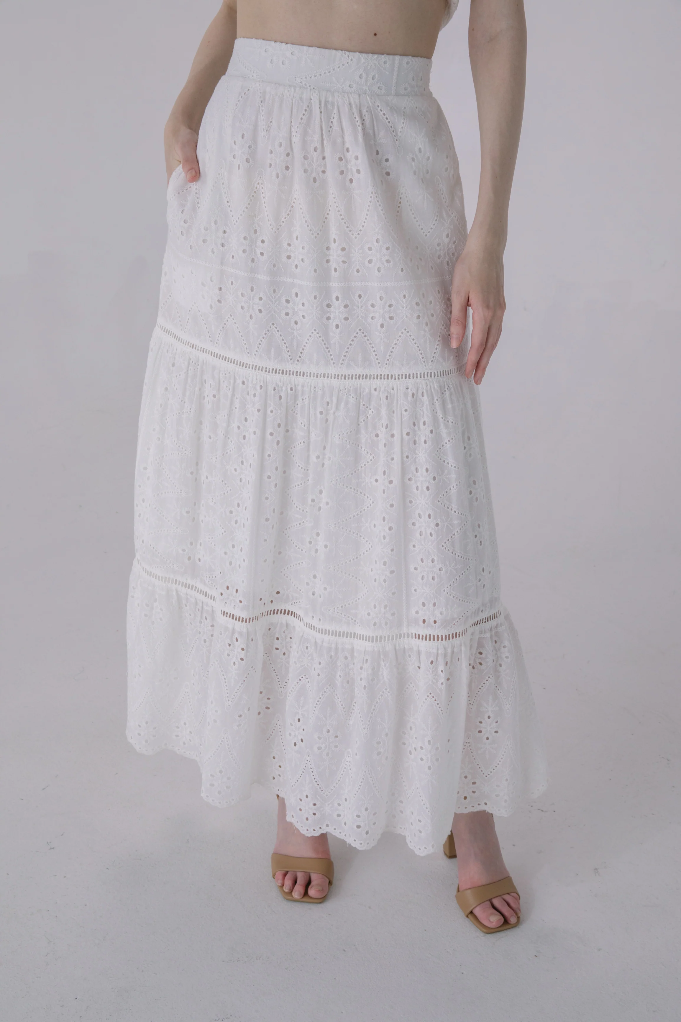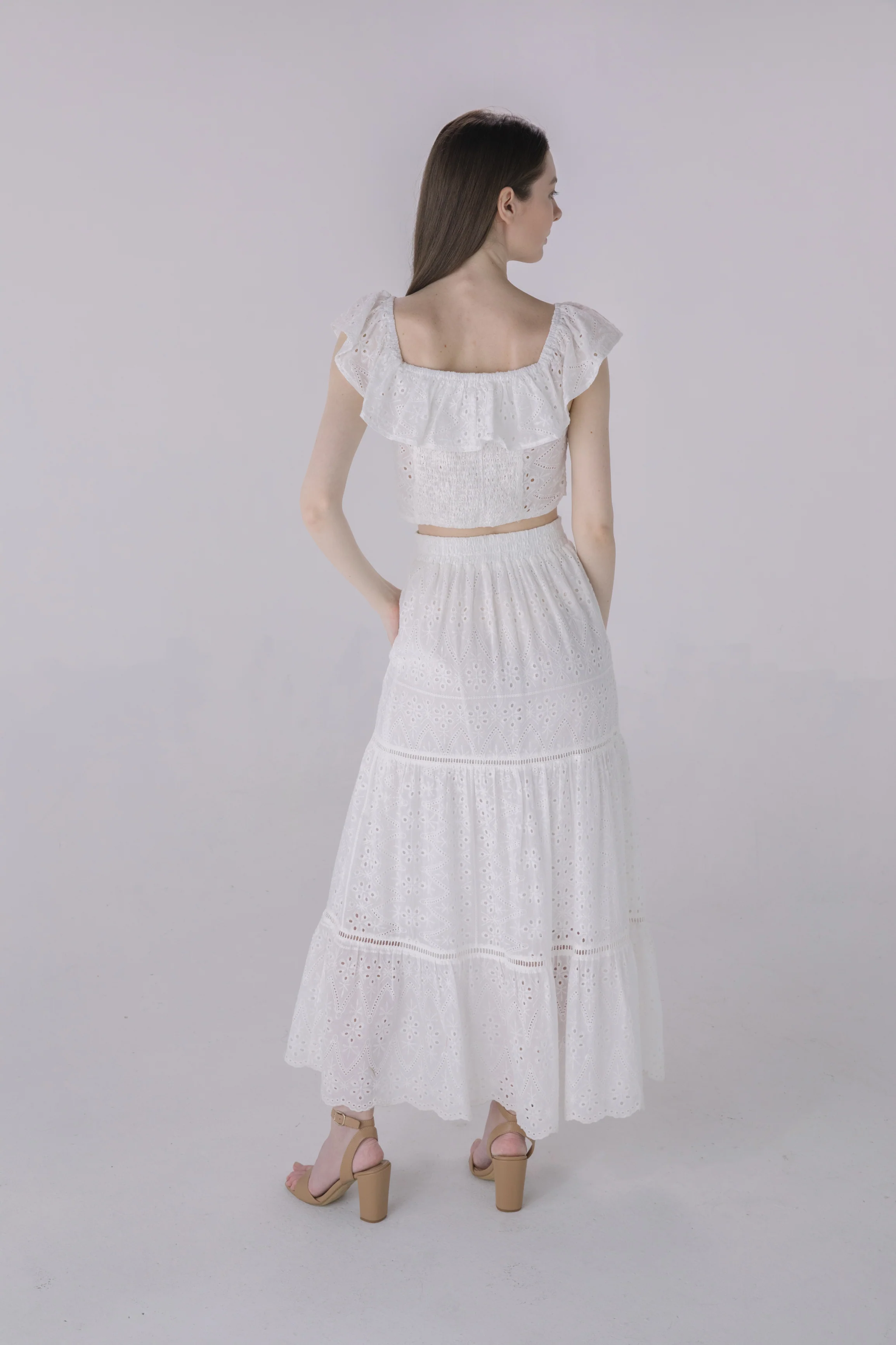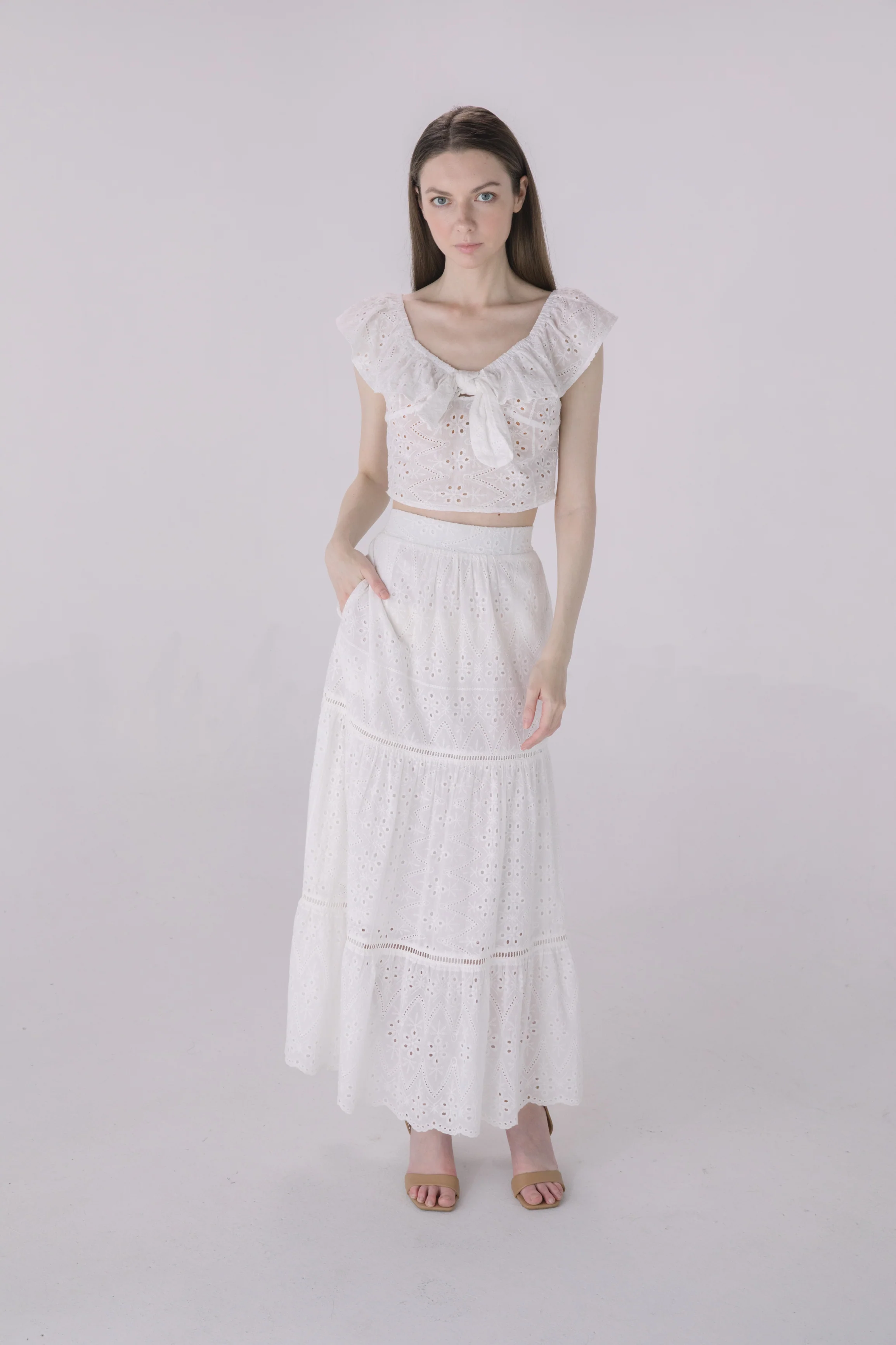 - Gorgeous White Eyelet maxi skirt. Must have in your closet this Summer! Wear it with the matching crop top to complete the look.
